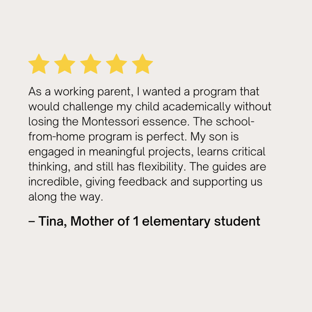Our Guided Homeschool Program combines structured weekly plans with full access to our Montessori curriculum, optional tutoring, live enrichment, and coaching. Families enjoy flexibility while receiving expert support, project-based assessments, and tools to track progress, empowering children to learn confidently at their own pace.