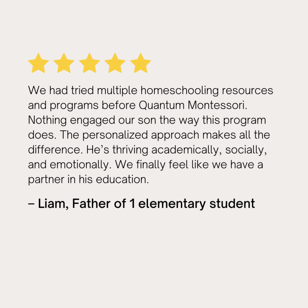 Our Independent Homeschool Program is designed for families who want a self-directed, student-led approach. Students follow sequenced, standards-aligned work plans provided by Quantum Montessori, with guidance from a home guide as needed. Optional private tutoring is available. There are no live guidance commitments, giving families full flexibility while accessing high-quality Montessori education.